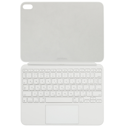 Magic Keyboard для iPad 10 (2022) воспринимается не просто как аксессуар, а как попытка приблизить планшет к формату компактного ноутбука. В отличие от более простых чехлов с клавишами, здесь акцент сделан на удобстве набора текста и стабильности конструкции. Клавиши получили механизм с ходом около 1 мм, поэтому печатать заметно комфортнее по сравнению с предыдущими решениями без чёткой тактильной отдачи. При этом сам корпус стал чуть жёстче, что отражается на устойчивости при работе на коленях или столе. Такой формат подойдёт тем, кто часто работает с текстами, отвечает на письма, ведёт заметки или использует планшет как основной инструмент для повседневных задач.